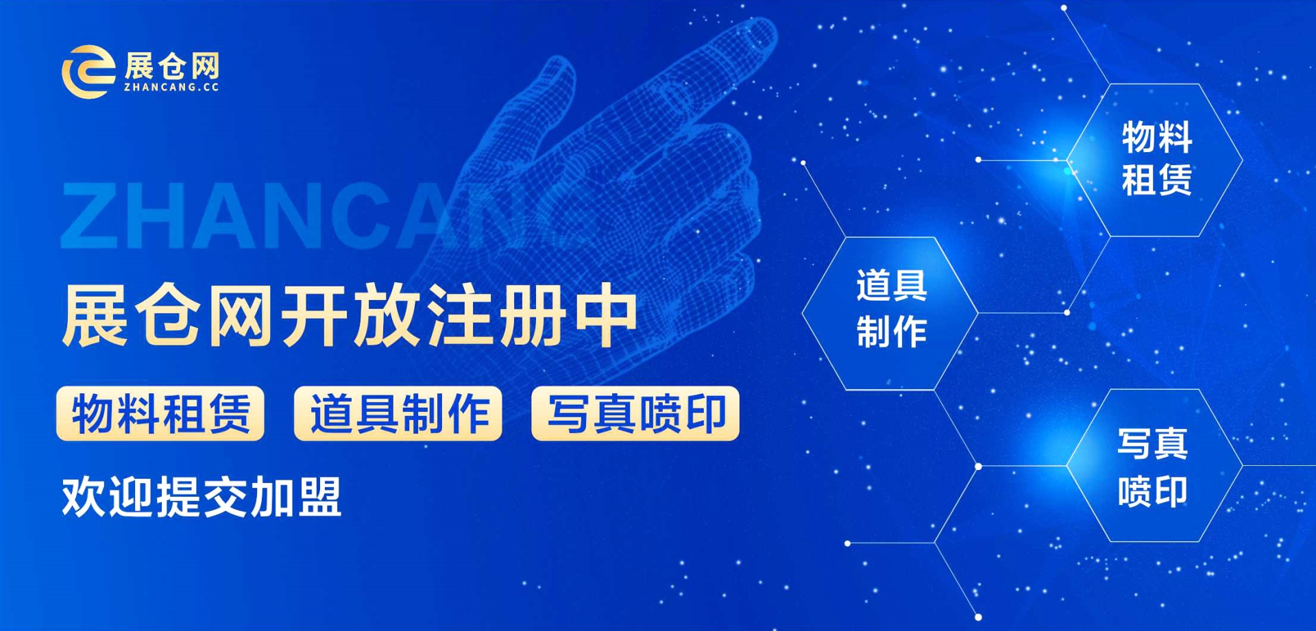 展仓网开放注册中 物料租赁 道具制作 写真喷印欢迎提交加盟 开通展仓网门店 获得专属店铺 展示推广商品及服务 开通展仓网店铺 获得更多客户资源 标准化内部流程 入驻展仓网 场地资源 开通店铺 展示共享资源 欢迎各类场地资源 酒店露营商超会所婚庆各类大小场地免费入驻展示 获得专属店铺 同城本地化 资源展示 优质供应商入驻 撮合共创社区 提示道具使用率 周转率 共享赋能 创造收益 共享库区 开店创收 盘活库存 道具可干租可打包服务