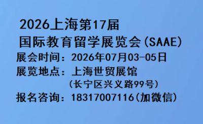 2026上海第十七届国际教育留学展览会(SAAE) 展会时间:2026年7月3-5日 展览地点:上海世贸展馆(长宁区兴义路99号)